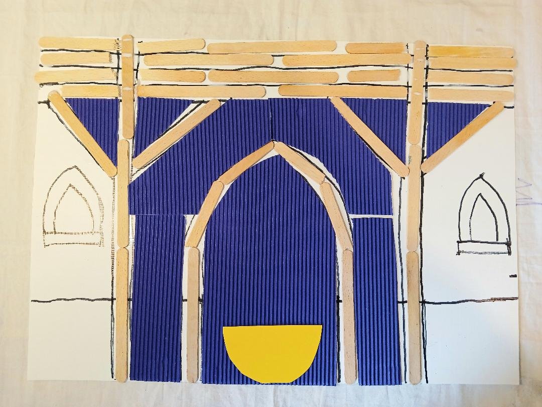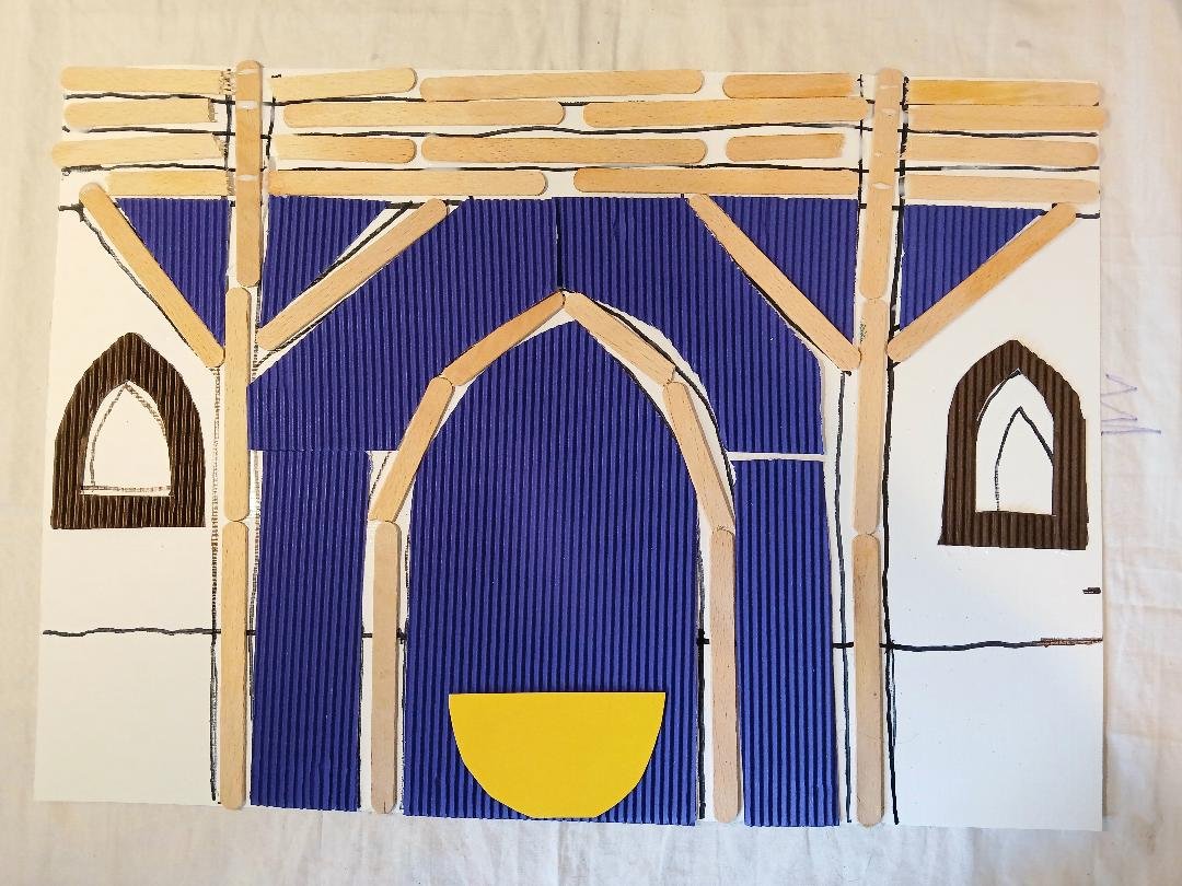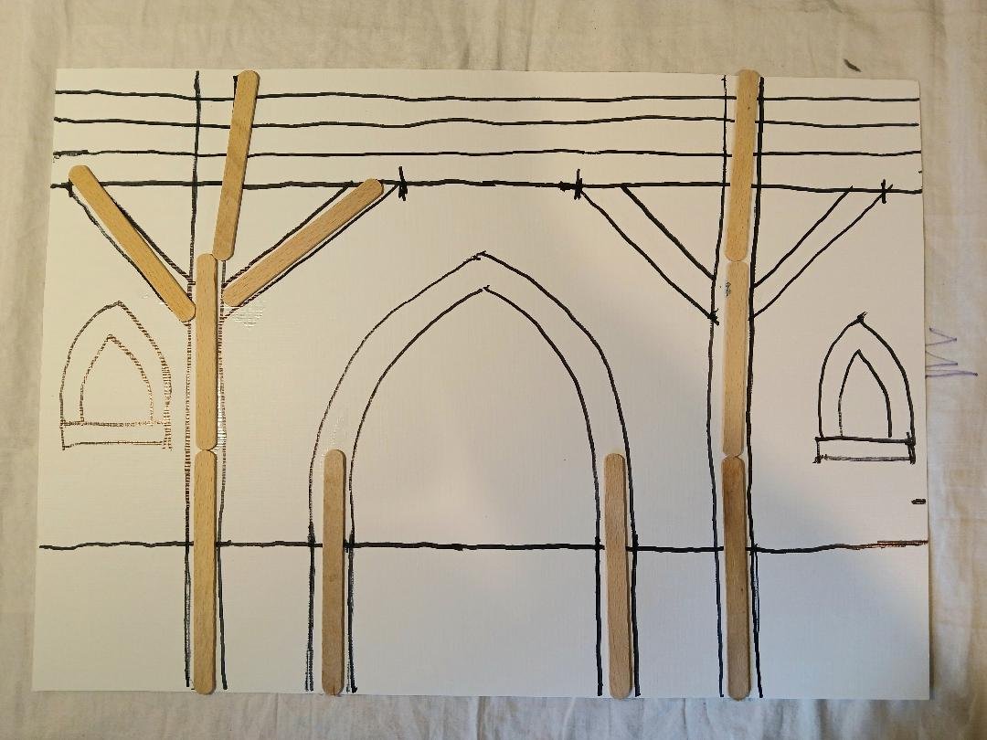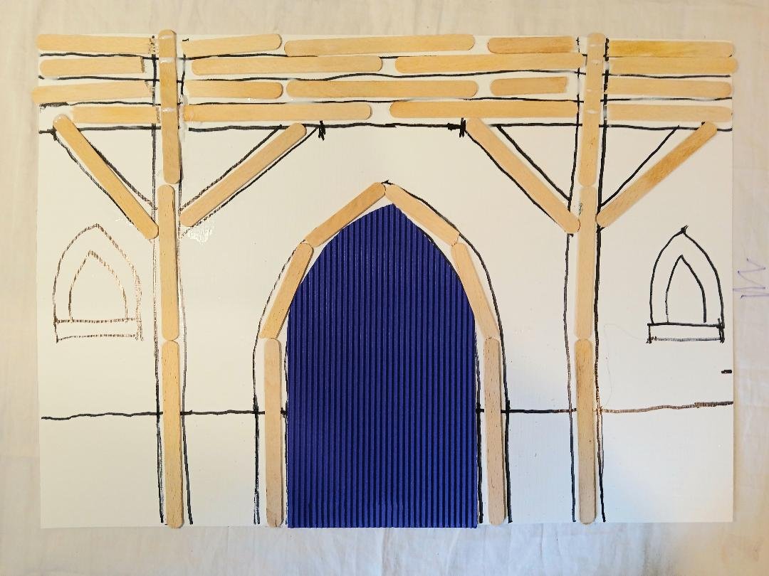 Paste on lolly sticks to the wood supports, then add corrugated card to the central arch, cut and paste to fit.