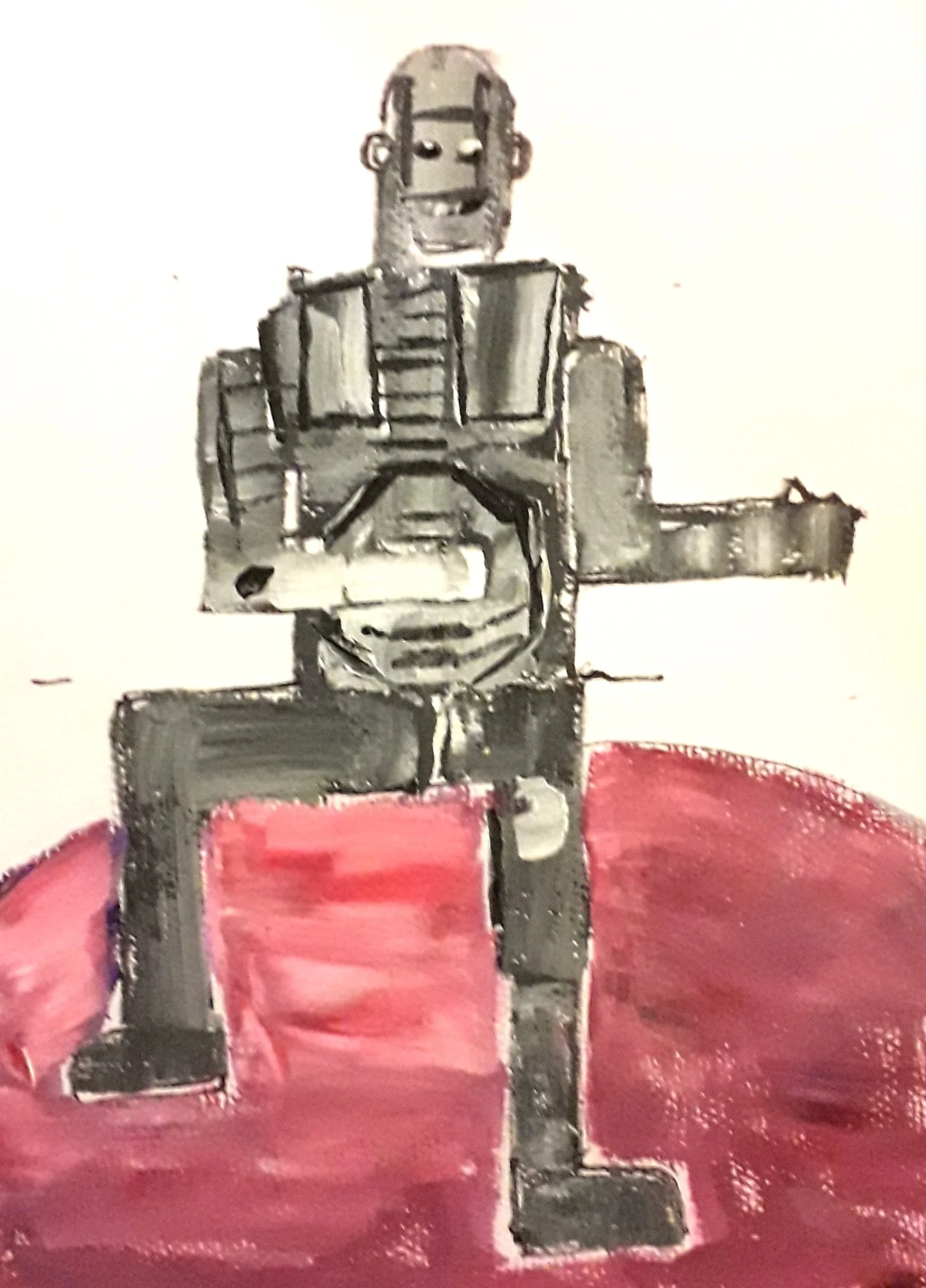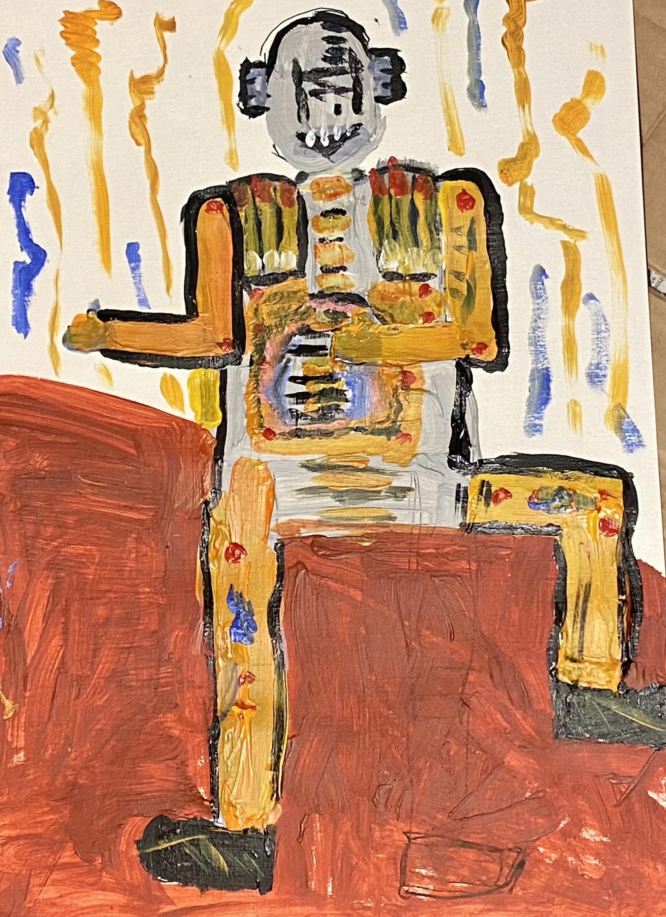 Jemima chose a robot to paint for the 1st session in 2022. We called him Roddy the Robot, and started by drawing him out on the paper, using rectangles for the main body features. She had help from her dad.